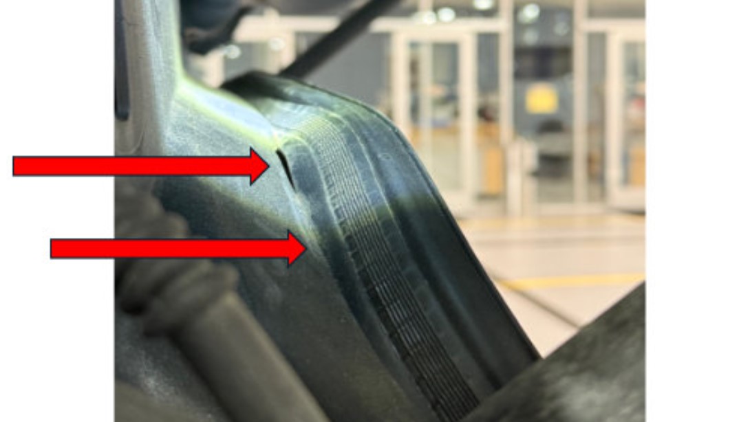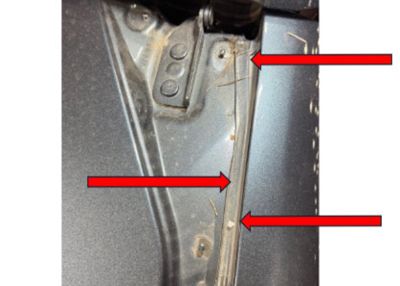 Joints de carrosserie – Les garnitures de gouttière gauche et droite sont retirées et les zones de joint de carrosserie sont inspectées pour détecter d’éventuels vides dans le mastic (Fig. 13). Nettoyer et refaire les joints si des vides sont constatés.