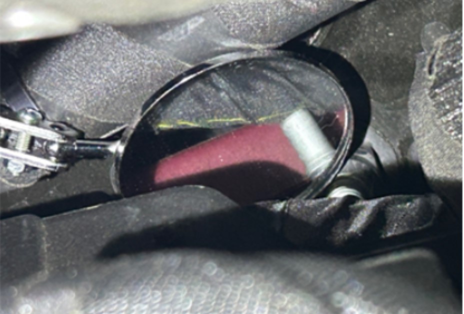 - Bulletin n° 25-NA-347 : friction du faisceau de câbles du moteur entre les connecteurs X2 et X201 du module de commande du moteur (ECM), à environ 5 à 7 pouces de l’ECM. Le point de contact et la friction du faisceau de câbles qui en résulte peuvent se trouver au niveau du goujon de fixation de l’amortisseur de suspension avant droit – Colorado, Canyon 2023-2026 (Fig. 5)