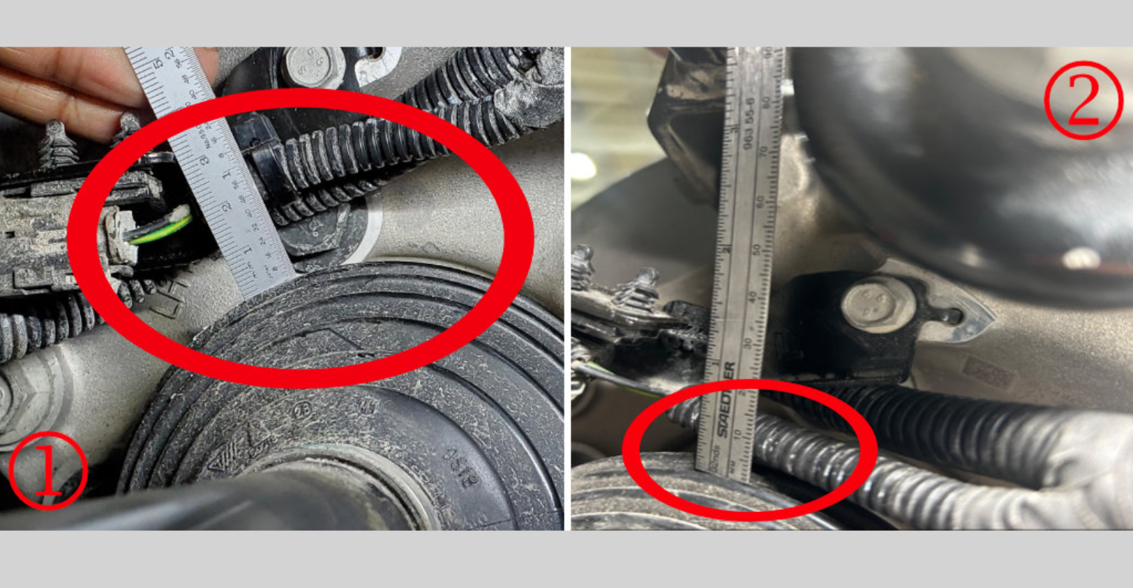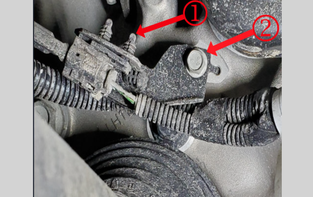 Vérifier le dégagement entre le joint extérieur du demi-arbre et le faisceau de câbles. Le jeu doit être supérieur à 10 mm (Fig. 12, n° 1). Si le jeu est inférieur à 10 mm (Fig. 12, n° 2), installer le support révisé disponible. Le nouveau support redirigera le capteur d’usure de plaquette de frein afin qu’il se trouve à plus de 10 mm du soufflet de demi-arbre.