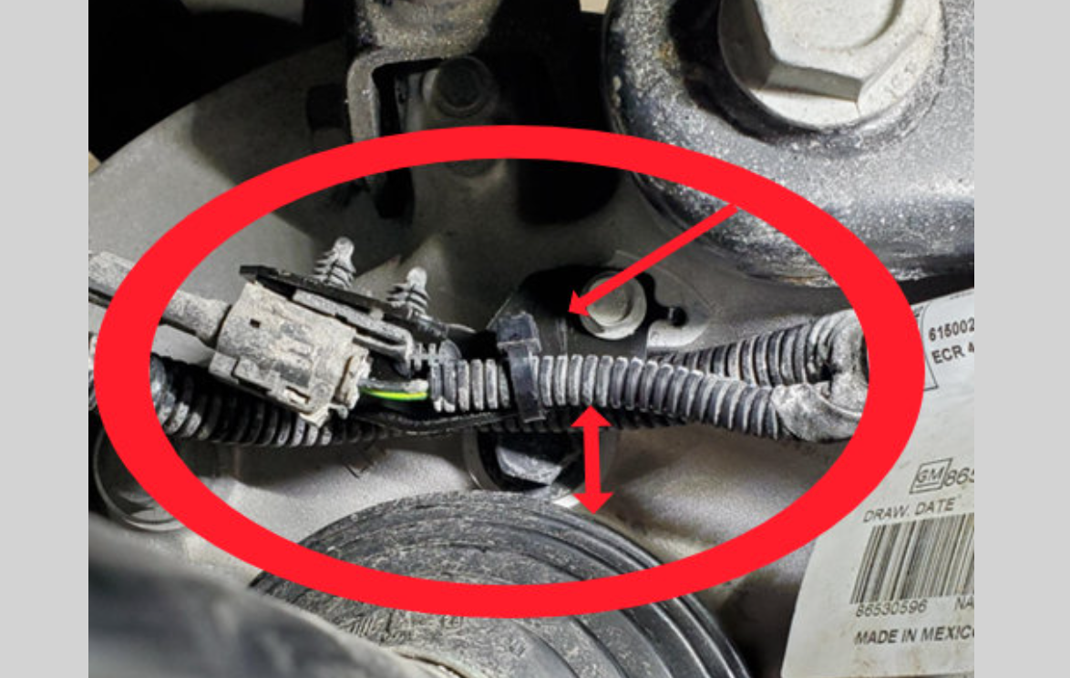 Le soufflet de demi-arbre arrière gauche de certains modèles Tahoe, Suburban, Yukon et Escalade 2021-2025 peut présenter des fuites ou être endommagé. Le dommage peut avoir été causé par un mauvais acheminement du capteur d’usure de plaquette de frein, qui est entré en contact avec le soufflet de demi-arbre (Fig. 11).