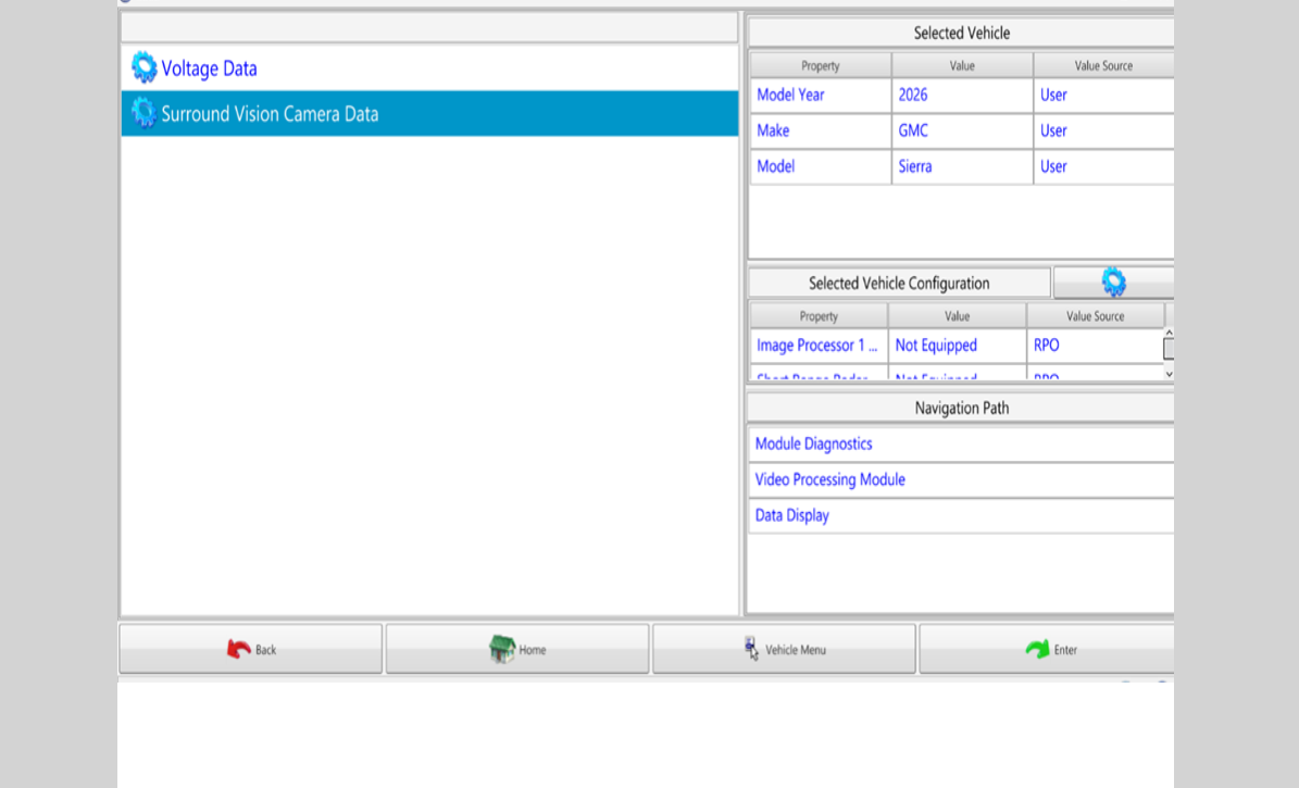 CONSEIL : le système de caméra à vision panoramique (équipement facultatif commun (RPO) UV2 : Vision-360 View, Mono, HD Digital) n’inclut pas le rétroviseur avec caméra de recul intégrée (RPO DRZ : rétroviseur intérieur – photosensible, Affichage vidéo intégral). Le rétroviseur avec caméra de recul doit toujours être diagnostiqué séparément en cas de problème.