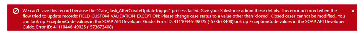 Les personnes qui ne sont pas propriétaires d’un dossier ne peuvent pas clôturer les tâches ouvertes d’un dossier fermé et reçoivent actuellement l’erreur suivante : (Fig. 21)