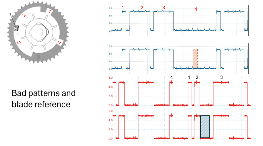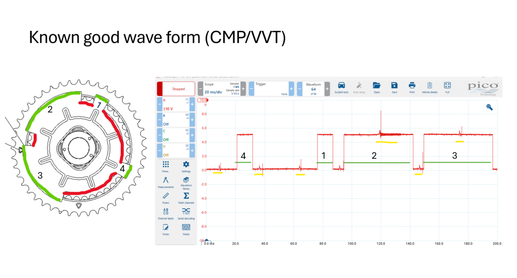 Pour faciliter le diagnostic, il est possible d’utiliser le PicoScope pour évaluer les capteurs de position de l’arbre à cames. Le centre d’assistance technique (TAC) de GM a constaté une augmentation des remplacements de capteurs, de circuits et de module de commande du moteur (ECM) en raison des codes d’anomalie (DTC) P0340/341 et P0011/0016, sans que l’on ait vérifié la courbe d’oscilloscope de la bague d’interruption de l’actionneur. La comparaison de la forme d’onde d’une bague d’actionneur potentiellement endommagée avec celle d’une bague en bon état peut accélérer le diagnostic, compte tenu du temps et de la main-d’œuvre nécessaires au démontage du moteur, et éviter ainsi le remplacement inutile de pièces.