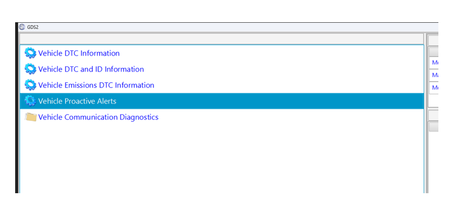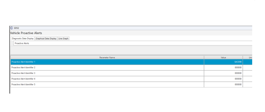 Le client peut fournir l’identifiant d’alerte proactive. Sinon, utiliser l’analyseur-contrôleur pour sélectionner Vehicle Diagnostics (Diagnostics de véhicule) > Vehicle Proactive Alerts (Alertes proactives de véhicule) pour lire les identifiants d’alertes proactives sur le véhicule (Fig. 1-3). Actuellement, aucun code d’anomalie (DTC) associés n’est enregistré dans le véhicule.