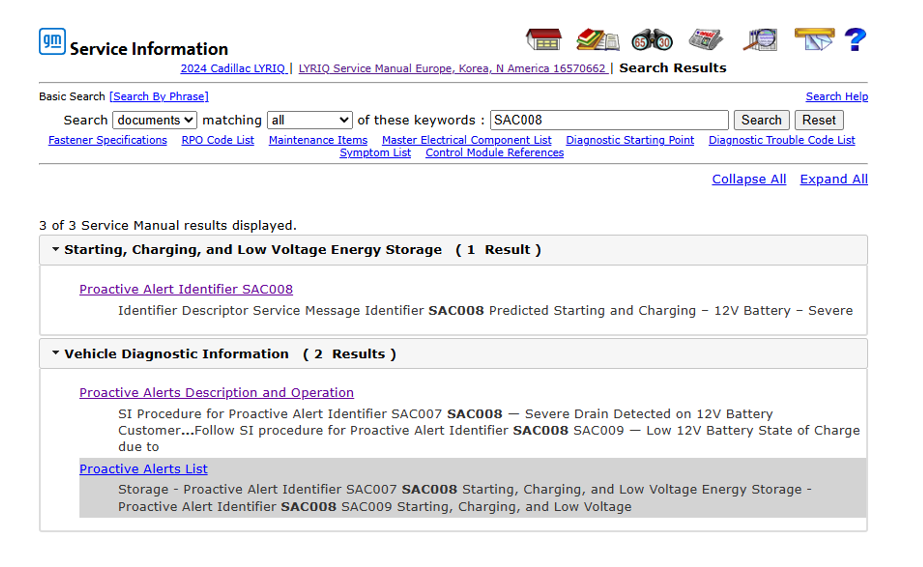 Pour accéder aux procédures d’informations de service, rechercher l’identifiant d’alerte proactive correspondant, par exemple SAC008 (Fig. 4-5),