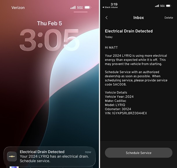 Les clients doivent s’inscrire pour profiter du service par l’entremise d’OnStar afin de recevoir les alertes proactives. Une fois inscrits, ils peuvent recevoir des notifications poussées et des messages dans la boîte de réception mobile via l’application myBrand (Fig. 6) lorsqu’une fuite parasite est détectée. D’autres canaux de notification, tels que les courriels et les textos, seront disponibles à l’avenir.