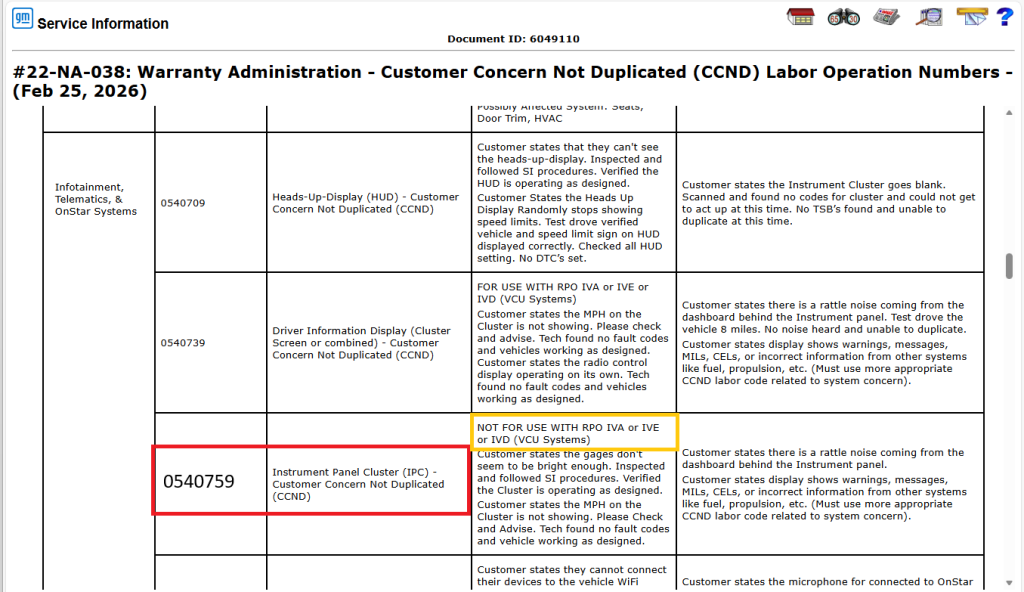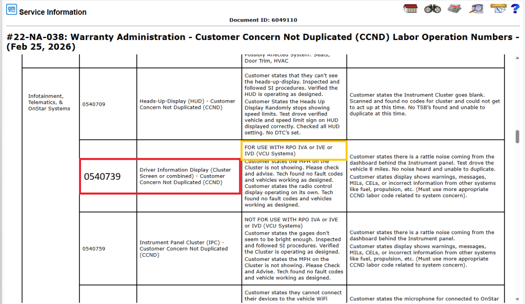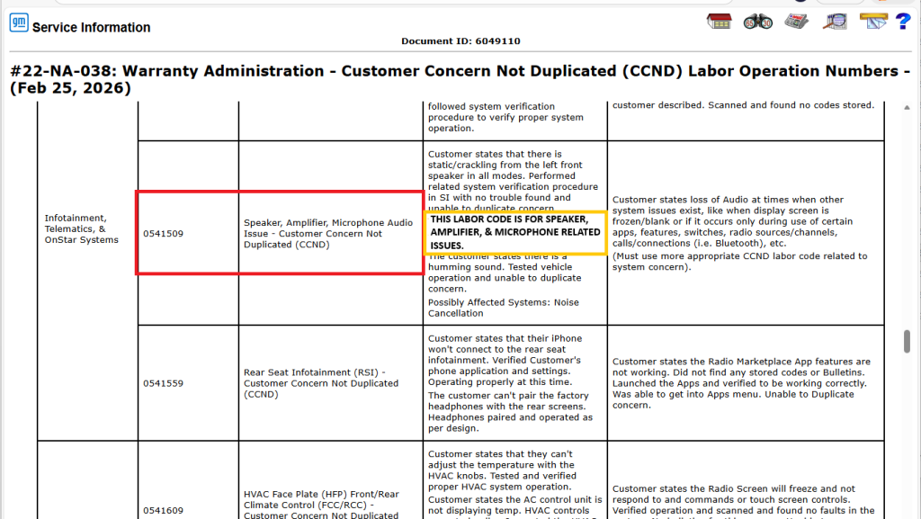 Une mise à jour du bulletin n° 22-NA-038 a été publiée. Elle porte sur les modifications apportées à plusieurs interventions techniques relevant de la catégorie « Customer Concern Not Duplicated » (CCND) et visant à résoudre des problèmes d’affichage et de système audio sur les voitures particulières et les camions GM des années 2022 à 2027 (à l’exception des modèles Chevrolet LCF). Le bulletin mis à jour fournit une liste des interventions techniques, accompagnée de descriptions et de recommandations concernant les problèmes de CCND liés à divers systèmes du véhicule.